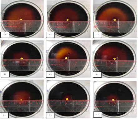 Kết quả khảo sát cho thấy chủng Tricho 1 (1.2) và Tricho 3 (3.1) có hiệu quả phân giải tinh bột cao với đường kính vòng phân giải đều là 5,167 cm, khác biệt có ý nghĩa thống kê so với các chủng khác (P < 0,05), vòng phân giải D ≥ 2,5 cm nên hoạt tính enzyme rất mạnh. Đối với chủng Tricho 2 (2.2), Tricho 5 (4.2) và Tricho 6 (5.2) có đường kính vòng phân giải lần lượt là 4,533 cm, 4,467 cm và 4,667 cm, khác biệt có ý nghĩa thống kê với các chủng khác, có D ≥ 2,5 cm nên có hoạt tính enzyme rất mạnh. Đối với chủng Tricho 4 (3.2) có đường kính vòng phân giải là 3,033 cm và chủng Tricho 7 (6.1) có đường kính vòng phân giải là 2,800 cm, khác biệt không có ý nghĩa thống kê với nhau, có D ≥ 2,5 cm nên có hoạt tính enzyme rất mạnh. Giữa 2 chủng Tricho 7 (6.1) và Tricho 9 (8.2) khác biệt không có ý nghĩa thống kê, đường kính vòng phân giải của chủng Tricho 9 (8.2) là 2,467 cm, có hoạt tính enzyme mạnh (D ≥ 2,0 cm). Còn chủng Tricho 8 (7.3) có đường kính vòng phân giải là 1,433 cm, có hoạt tính enzyme trung bình (Hình 1).