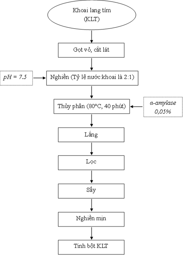 Enzyme α-amylase tỏ ra hiệu quả cao trong quá trình thủy phân dịch tinh bột, chuẩn bị nguyên liệu cho quá trình chế biến sản phẩm tiếp theo từ nguồn nguyên liệu khoai lang tím. Kết quả nghiên cứu cho thấy tỷ lệ nước và khoai lang tím được chọn cho quá trình thủy phân tốt nhất là 2:1 (w/w), pH là 7.5. Bên cạnh đó, hiệu suất thu hồi dịch thủy phân cũng đạt được cao nhất khi thực hiện quá trình thủy phân tinh bột khoai lang tím ở 80ºC trong thời gian 40 phút cùng với nồng độ enzyme α-amylase sử dụng là 0,05%. Từ đó, thiết lập được sơ đồ quy trình công nghệ chế biến tinh bột từ khoai lang tím đạt chỉ tiêu chất lượng, đảm bảo an toàn thực phẩm.