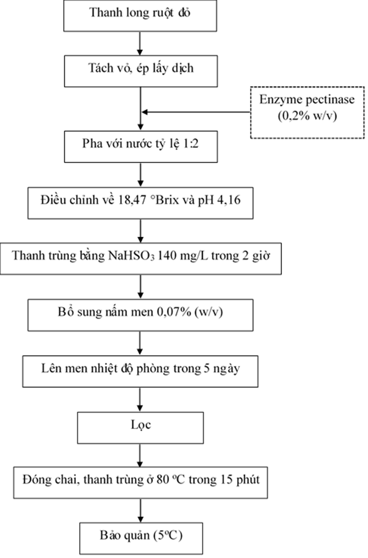 Nghiên cứu nhằm xây dựng quy trình lên men cider thanh long ruột đỏ thông qua xác định các nhân tố ảnh hưởng đến quá trình lên men bao gồm tỉ lệ pha loãng (1:1; 1:2; 1:3 w/v), thời gian lên men (2, 3, 4, 5 ngày), độ Brix (14 - 22°Brix), pH (3,8 - 5,0) và nồng độ nấm men Saccharomyces cerevisiae BV818 (0,02 - 0,1% w/v). Kết quả cho thấy phương pháp xử lý nguyên liệu cho hiệu quả tốt với enzyme pectinase 0,2% w/v. Sau 5 ngày lên men ở tỉ lệ nguyên liệu và nước là 1:2 w/v, 18,5 ºBrix, pH 4,16, nồng độ nấm men 0,07% w/v tạo ra sản phẩm cider thanh long ruột đỏ có hàm lượng ethanol đạt 4,79% v/v.